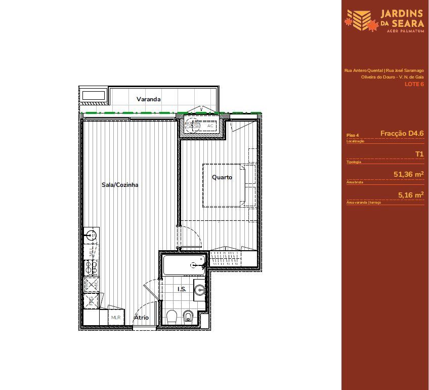 Com 69m2 de área bruta, 51m2 de área bruta privativa, 1 frente (Poente), é composto por hall de entrada com vídeo porteiro, sala e cozinha open space com acesso a varanda, cozinha equipada (placa, forno, exaustor, micro-ondas, máquina de lavar loiça e combinado), um quarto com roupeiro embutido, WC completo e lugar de garagem na cave.