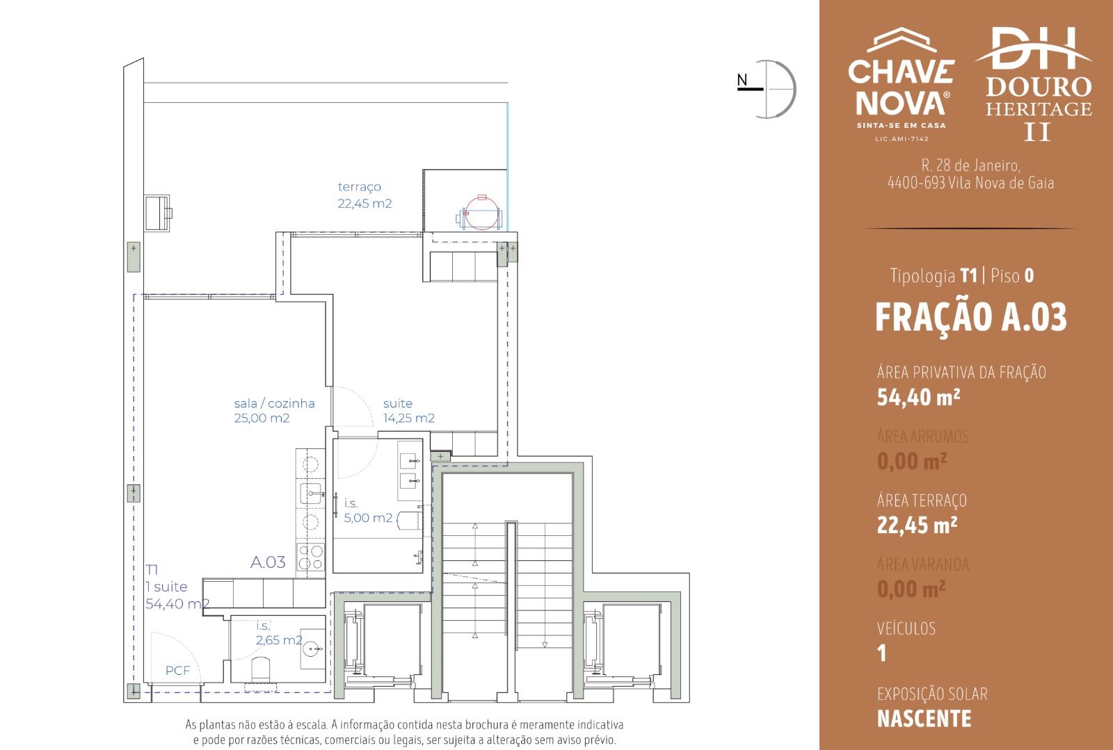 Área bruta 91.45m2, área bruta privativa 54.40m2, terraço 22,45m2 e lugar de garagem 14,60m2.